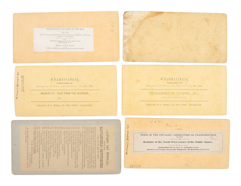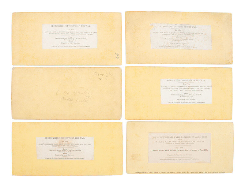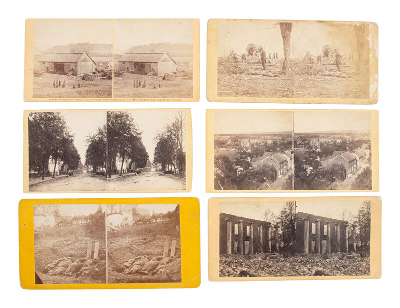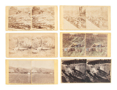 12 stereoviews on yellow and buff mounts, many with E. & H. T. Anthony's "Photographic Incidents of the War" labels on verso crediting the negatives to Alexander Gardner, and some with other backmarks and labels including that of R. Newell, Philp & Solomons, and Tipton. Scenes include: Smith's Barn, Near Keedysville, Used as a Hospital After the Battle of Antietam. -- View on Battle Field of Antietam Near Sherrick's House, Where the 79th New York Volunteers Fought After They Crossed the Creed. Group of Dead Confederates. -- Ditch on the Right Wing, Where Kimbal's Brigade Fought So Desperately at the Battle of Antietam. -- Remains of the North-West Corner of the Public Square (in Chambersburg). -- Dead Soldiers - centre of field (in Gettysburg). -- And 7 others. -- Together, 12 stereoviews.