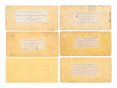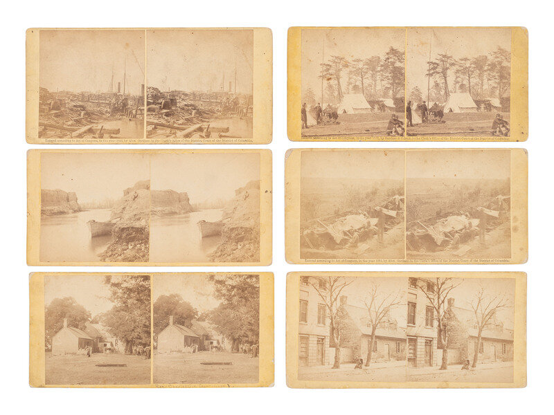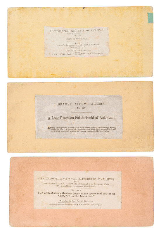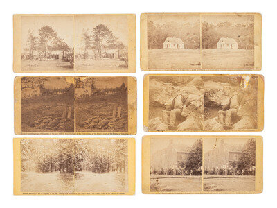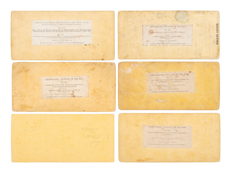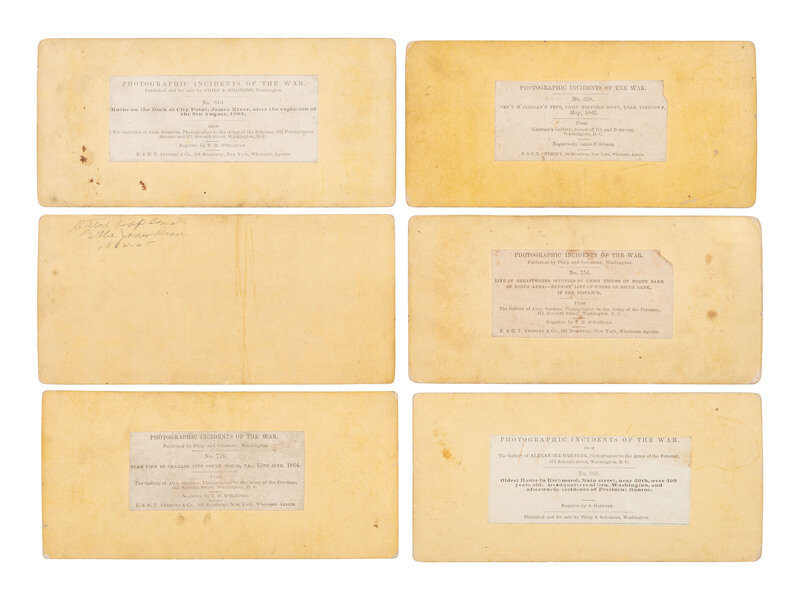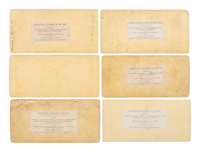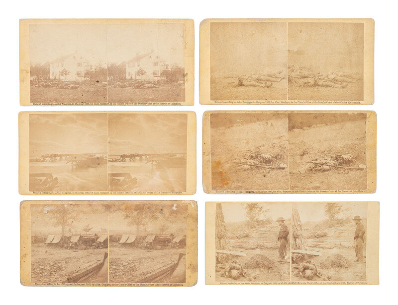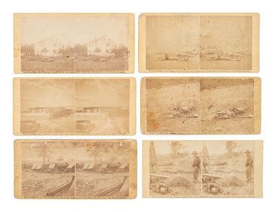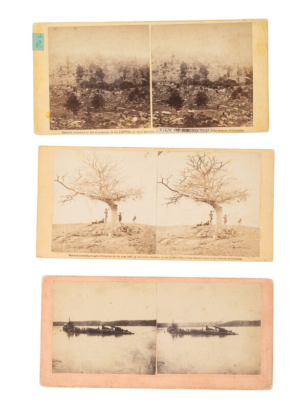 21 stereoviews, most on yellow mounts and with Gardner's "Photographic Incidents of the War" paper labels affixed to versos and/or Gardner's copyright imprint on mount rectos. Titles include: View Around Abraham Trossel's House, Near Centre of Battle-Field of Gettysburg. -- Interior View of Rebel Redoubt, Commanding Chesterfield Bridge on North Anna, Captured by 2d Corps Under Gen. Hancock, 23d May, 1864. -- Scene in a Wheat-Field on the Confederate Right, at the Battle of Gettysburg. -- War Effect of a Shell on a Confederate Soldier at Battle of Gettysburg. -- A Contrast. Federal Buried; Confederate Unburied, Where They Fell on Battle Field of Antietam. -- Ruins on the Dock at City Point, James River, After the Explosion of the 9th August, 1864. -- Rear View of Charles City Court House, Va., 13th June, 1864. -- Gen'l. M'Clellan's [sic] Tent, Camp Winfield Scott, Near Yorktown, May, 1862. -- Unfinished Confederate Grave Near the Centre of Battle-Field of Gettysburg. -- Rear View of Winter Quarters of Telegraphic and Photographic Departments, Attached to Headquarters Army Potomac, April, '64. -- Tunker Church, on Battle Field of Antietam. -- All Over Now - Confederate Sharp-Shooter at Foot of Round Top, Gettysburg. -- And several others. -- Together, 21 stereoviews.