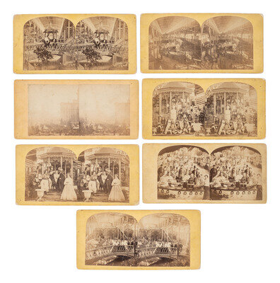 13 stereoviews on yellow, buff, and salmon colored mounts, most with "Shaw's Instantaneous Views" labels applied to verso with subject line accomplished in pencil: "Sanitary fair Chicago." Specific booths and vendors captured include the Methodist booth and Wright's Restaurant. Other views include a street view capturing the opening day procession at Court House Square; a group portrait of men and women posed in a booth or float decorated with horse shoes and a wire sign above reading "Burden;" an interior view of one of the buildings lined with heavily decorated stalls and banners for each state; an exterior view of Union Hall; 2 interior views of people posed on a beautifully constructed footbridge; a group portrait of a trio of women dressed with large turbans on their heads on the steps of a gazebo; and others. -- Together, 13 stereoviews.