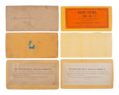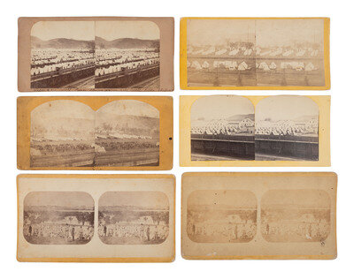 6 stereoviews on yellow and buff mounts, some with applied paper labels to verso and some with inscriptions. Includes 2 copies of the same image, described on verso label thusly: "The Union Prison Camp at 'Bell Isle,' Richmond, VA. / Maj. Thos. P. Turner, Commandant of the 'Libby Prison,' dressed in gray, with felt hat on, seen as prominent figure on hill overlooking the encampment. The Confederate guard tents at brow of the river in the distance. The original negative of this view destroyed by fire on the 3rd of April 1865." -- One example published by J. E. Larkin of Elmira, NY, featuring a long line of soldiers standing shoulder-to-shoulder, with bayonets pointed upward in front of several rows of tents. -- And 3 others. -- Together, 6 stereoviews.