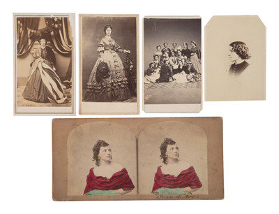 CDV studio portrait of Union nurse Major Belle Reynolds. New York: E. & H. T. Anthony, ca 1862. Penciled identification on verso along with Anthony's imprint. -- CDV studio portrait of a woman wearing an American flag draped over her shoulder and a hat topped with what appears to be a taxidermy eagle. Draped flags hang in the background. Cleveland, OH: J. F. Ryder, n.d. Verso bears Ryder's imprint. Accompanied by small remnant of a CDV sleeve with penciled inscription: "Miss Mary McHenry." -- CDV group portrait of 12 ladies and one man. Albany, NY: J. H. Abbott, ca 1864. Verso bears Abbott's imprint along with ink inscription reading, "French Booth, Army Relief Bazaar, Albany, N.Y., February 1864." -- Stereoview portrait of Pauline Cushman wearing an off-the-shoulder draped cloth on top, which has been hand-colored in red. N.p.: n.p., n.d. Ink inscription beneath image and printed paper label on verso identify the subject as "Joan of Arc." Cushman was known as the Union's "Joan of Arc" for her sacrificial service as a spy for the Union cause. -- Vignetted bust profile portrait of abolitionist and women's rights activist Anna Dickinson. Philadelphia, PA: F. Gutekunst, n.d. Corner clipped. -- Together, 5 CDVs.