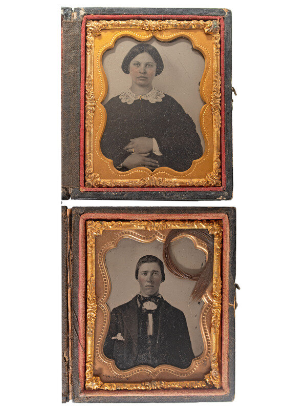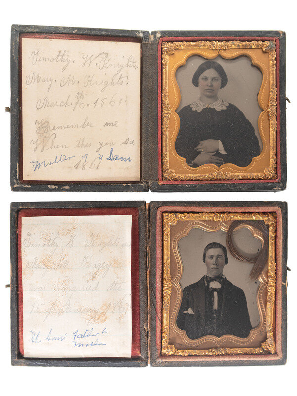 2 ninth plate ambrotypes featuring studio portraits of Timothy W. Knight(s) and Mary M. Knight(s), each housed in full cases with period pencil identifications on enclosed papers. Timothy's image contains a lock of hair. Period identification reads: "Timothy W. Knights and Mary M. Kagey was married the 15 of January 1861" The couple lived in Mt. Jackson, Shenandoah Co., Virginia.