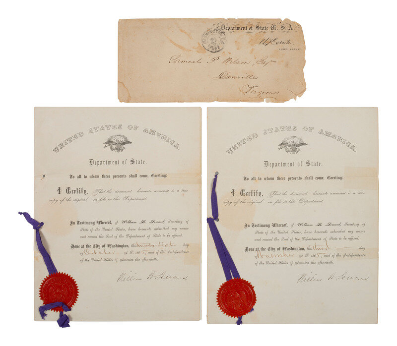 2 documents, being true copies of a pardon acknowledgement and an oath of allegiance, both separately enclosed in partly-printed official Department of State certifications bearing original seals, stamp signatures of William H. Seward, and respective dates of 23 October and 3 November 1865. Accompanied by a postally used official Department of State envelope addressed to Samuel P. Wilson of Danville, VA, with Department of State wax seal.