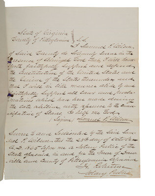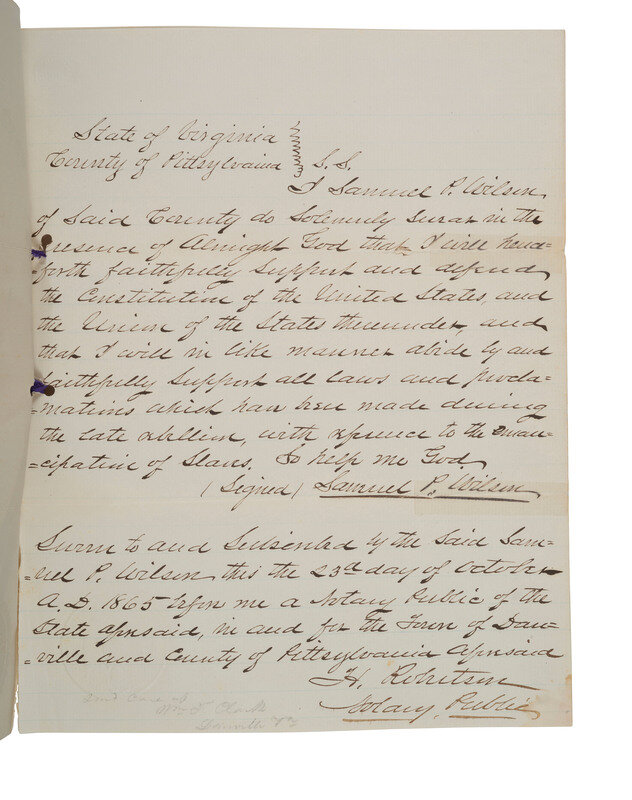 7 3/4 x 9 7/8 in., separations with taped repair, dampstaining to bottom right corner, 2 holes punched to left edge. Manuscript oath of allegiance sworn to and subscribed by Samuel P. Wilson on 23 October 1865 before a notary public. In part: "I Samuel P. Wilson, of said county do solemnly swear in the presence of Almighty God that I will henceforth faithfully support and defend the Constitution of the United States, and the Union of the States thereunder, and that I will in like manner abide by and faithfully support all laws and proclamations which have been made during the late rebellion, with reference to the emancipation of slaves."
