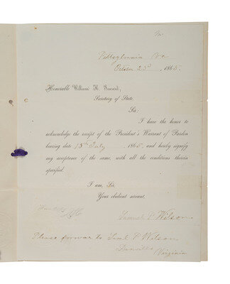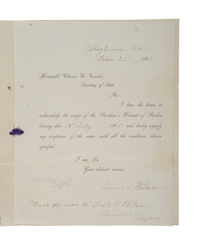 7 5/8 x 9 3/4 in., separations with taped repair, 2 holes punched to left edge, minor spotting. Partly-printed acknowledgement of receipt of the President's Warrant of Pardon. Pittsylvania, VA, 23 October 1865. In part: "I have the honor to acknowledge the receipt of the Presidents Warrant of Pardon bearing date 15th July, 1865, and hereby signify my acceptance of the same, with all the conditions therein specified. Ink inscription below reads, "Please forward to Saml P. Wilson, Danville, Virginia."