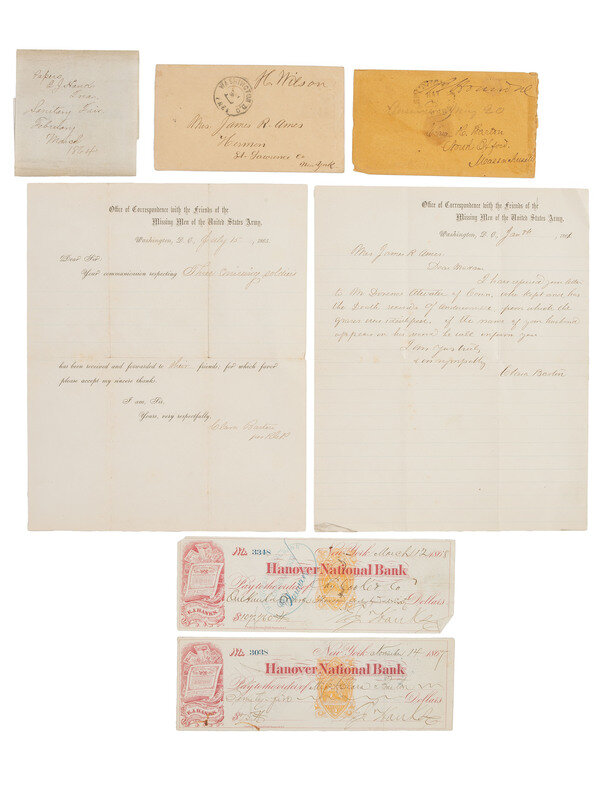 BARTON, Clara (1821-1912). Autograph letter signed ("Clara Barton"), as official government correspondent for the "Office of Correspondence with the Friends of the Missing Men of the United States Army." Addressed to Mrs. James R. Ames. Washington, D.C., 8 January 1866. 1p, 8 x 10 in. (creasing, light soil). Barton notifies Mrs. Ames that she has referred her letter to "Mr. Dorence Atwater of Conn. who kept and has the Death records of Andersonville from which the graves are identified. If the name of your husband appears on his record he will inform you." With original transmittal cover in Barton's hand, free-franked ("H. Wilson") by Senator Henry Wilson of Massachusetts, the Chairman of the Senate Committee on Military Affairs from 1861-1873.