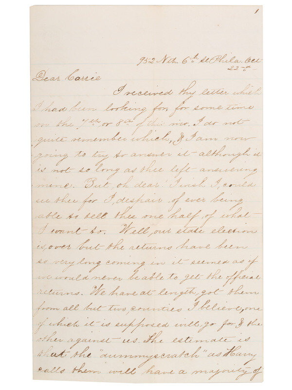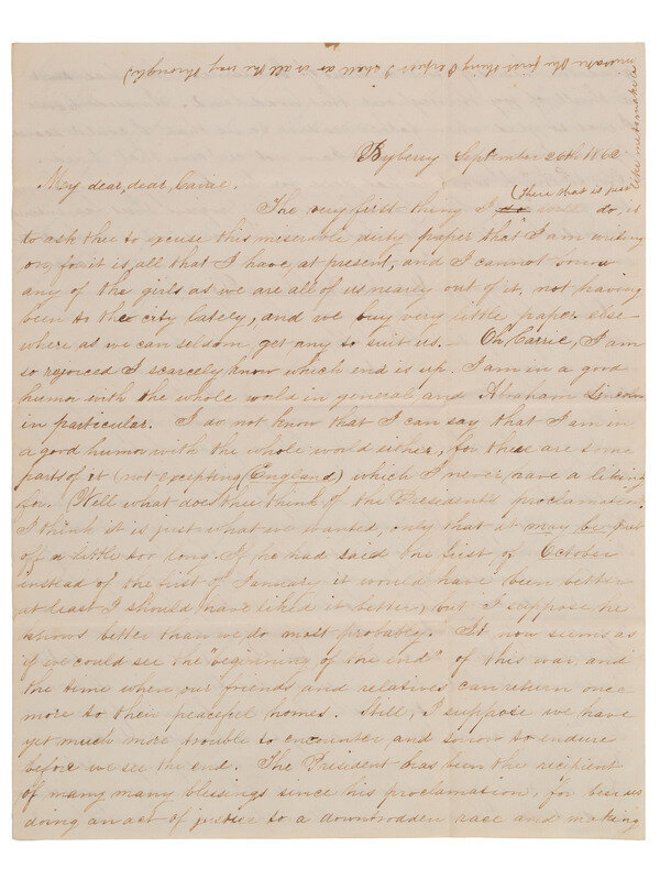 A particularly interesting letter written from Byberry on 26 September 1862 relates to Lincoln's preliminary Emancipation Proclamation, and the conscientious objections of some men to serving in the war: "Oh Carrie, I am so rejoiced and scarcely know which end is up. I am in good humor with the whole world in general and Abraham Lincoln in particular....Well what does thee think of the President's proclamation? I think it is just what we wanted only that it may be just off a little too long. If he had said the 1st of October instead of the 1st of January it would have been better.... The President has been the recipient of many blessings since his Proclamation for besides doing an act of justice to a downtrodden race and making glad the hearts of four million of bondsmen he has sent a thrill of joy throughout this broad land....Oh to think what he has done for this country for with the great curse which he has retarded here progress this far entirely removed she will become what no nation on earth ever had or ever will become....There is one thing I came very nearly to forgetting to tell thee and that is about our very 'conscientious and disabled' young men who have joined the glorious army of the exempts. Nearly all the young men around here went to get exempted and some of them took the conscientious oath that I know are not the least bit conscientious. Perjured themselves because they are cowards. A glorious set of young men are they not? Ca not go to to defend their country and yet enjoy all her privileges and blessings. They should be deprived of their right to vote and never again be considered as citizens....one thing I will say and that is our men are not half so good as our women (that is the generality of them for there are some gone from Byberry) for they do first rate in our society much better than I expected....)