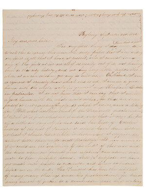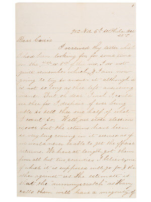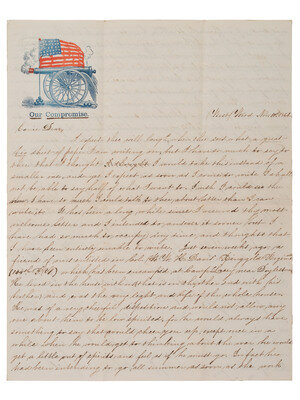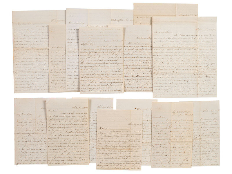 A collection of 25 autograph letters signed by Susan Walmsley to her friend Mary Caroline "Carrie" Wilson (1842-1900). Various locations, incl. "Byberry," "Philadelphia," 'West Wood," and "Ercildoun B.S. [Boarding School]," 1861-1867 (bulk 1861-1865). A fascinating letter archive written by an engaged and passionate Quaker woman, with interesting content throughout particularly related to the ongoing Civil War. Notably, Walmsley also makes reference to her work for a Philadelphia photographer, which served as a prelude to opening her own photographic studio in Philadelphia years later with her sister.