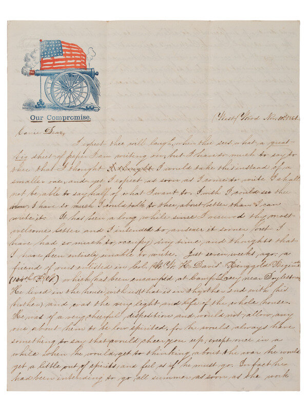 Walmsley's letter of 2 May 1861, the first in the archive after the start of the war, seems to show her conflict between support of the Union war effort and Quaker sentiment against violence of any sort: "I declare I am beginning to be almost scared I am getting so bloody. A short time since I should almost have shuttered at the idea of hanging any person but I pretty nearly feel sometimes as if I could stand and see some of of those traitors such as Jeff Davis and Mason strung right up by the neck or heels I don't care which...." Though she has no brothers, her letters trace the enlistment of a friend, "Landrum" who enlisted with the 104th Pennsylvania regiment. Her letters also discuss interesting Philadelphia area war-related events such as Governor Curtin visiting troops at Doylestown and presenting a regimental flag. attending the Sanitary Fair, visiting the encampment of the 28th Pennsylvania Regiment and witnessing instruction in Zouave tactics, a group of Byberry women who sew for soldiers, attending a lecture given by a reverend who was also a former Confederate prisoner of war, the October 1864 Pennsylvania state election, and attending a meeting of the 1st Battalion Soldiers Union Campaign Club. Her letters have regular commentary on the ongoing war, and the commanders leading it.