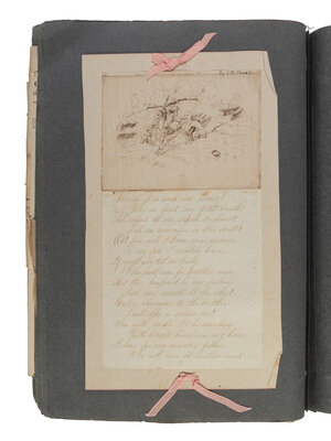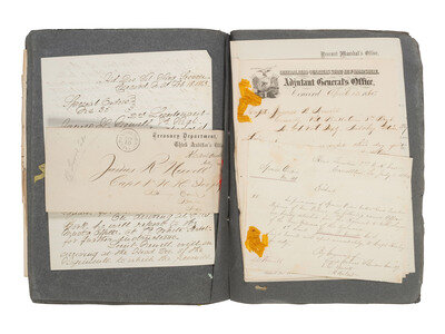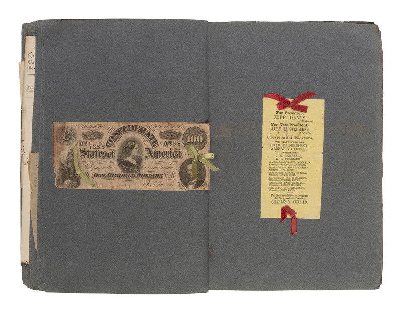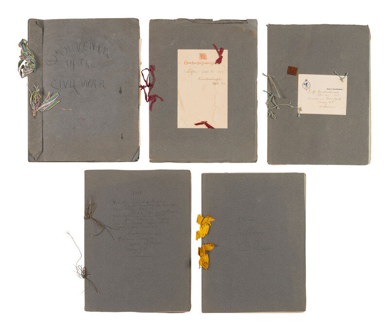 "Souvenir of the Civil War." Paper boards with 16 matching paper leaves. String bound. Each leaf with a paper document or piece of ephemera attached with ribbon tie-downs. Approx. 10 x 12 1/2 in. (wear to edges, light soil, some ribbons detached; contents of scrapbook bear small holes where ribbons secure items to pages). A soft cover scrapbook containing personal military papers and associated ephemera associated with the Civil War service of Major James R. Newell, Co. I, New Hampshire 8th Infantry. Various places, 1861-1865.