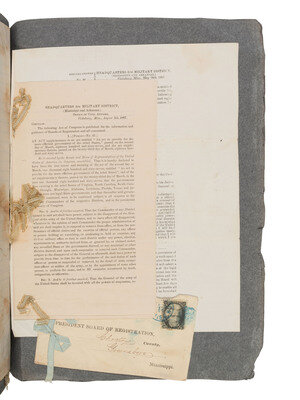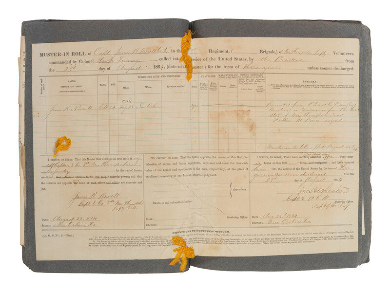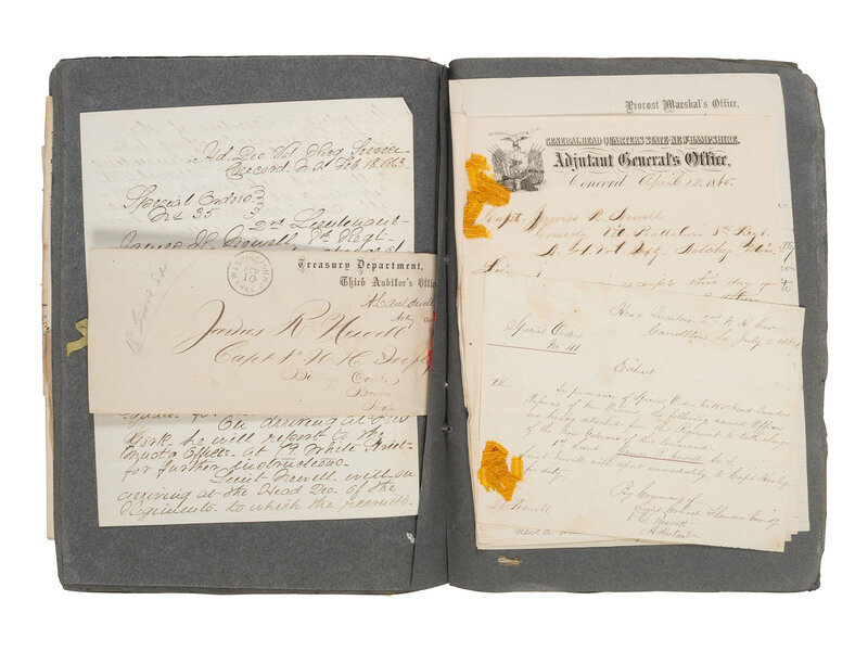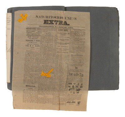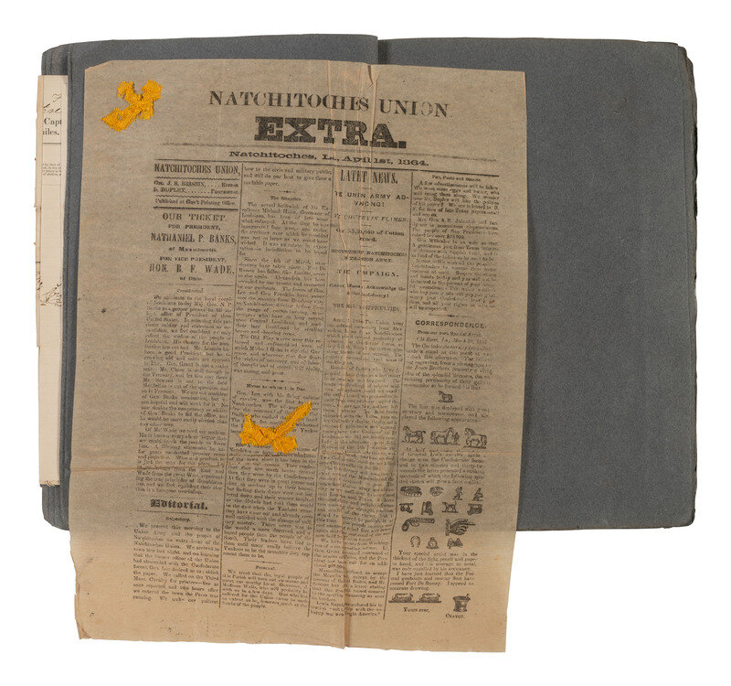 Enclosed within the scrapbook are approximately 25 documents/papers, highlighted by a scarce printing of the Civil War newspaper Natchitoches Union. Extra. Natchitoches, LA. 1 April 1864. 1p, printed on tissue paper. Approx. 15 1/4 x 12 in. This single-page edition was printed in the immediate aftermath of the Union Army's 1 April seizure and occupation of the town. An "Editorial" in the paper reads, in part: "We present this morning to the Union Army and the people of Natchitoches an extra issue of the Natchitoches Union. We arrived in town late last night, and on learning that the former editor of the Union had absconded with the Confederate forces, Gen. Lee desired us to publish the paper. We called on the Third Mass. Cavalry for printers -- five at once reported, and two hours after we entered the town the Press was running." Also contains the ticket for President of Nathaniel P. Banks of Massachusetts and Hon. B.F. Wade of Ohio for Vice President, and news of Union victories. 1st Lieut. James Newell and the New Hampshire 8th Infantry participated in the action at Natchitoches on 31 March 1864.