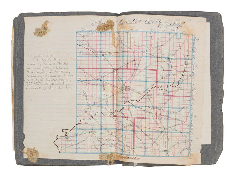 Other items contained within the scrapbook include: a commemorative sheet, ”Battles of the 8th Regiment New Hampshire Infantry”; certificates of promotion; Muster-In and Muster-Out Rolls for Newell; Newell's discharge; Confederate currency $100 bill; small campaign flyer promoting Jeff Davis, Alexander Stephens, and Charles M. Conrad of Louisiana for office; small pen and ink drawing signed by Newell depicting an infantry soldier administering to a prone wounded soldier, attached to a poem relating to the scene; two sets of manuscript "Special Orders" and other war-date papers; and a map of Choctaw County, Mississippi, 1867, drawn by Newell while employed by the U.S. government "To provide for the more efficient government of the rebel states."