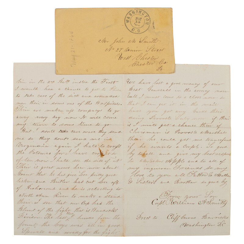 Autograph letter signed ("Corpl. William A. Smith") from Corporal William A. Smith, Co. D, 116th Pennsylvania Infantry, to his father, mother, and sisters. Cliffburne Barricks [sic], [Washington, D.C.], 12 May 1864. 3pp, 5 x 8 in. (creasing at folds, minor scattered spotting), Accompanied by a blue silk flag fragment with remnant of painted gold on fabric, approx. 3 1/2 in x 3/4 in. (fraying at edges). Both transmitted in original cover to Mr. John M. Smith of West Chester, Chester Co., Pennsylvania.
