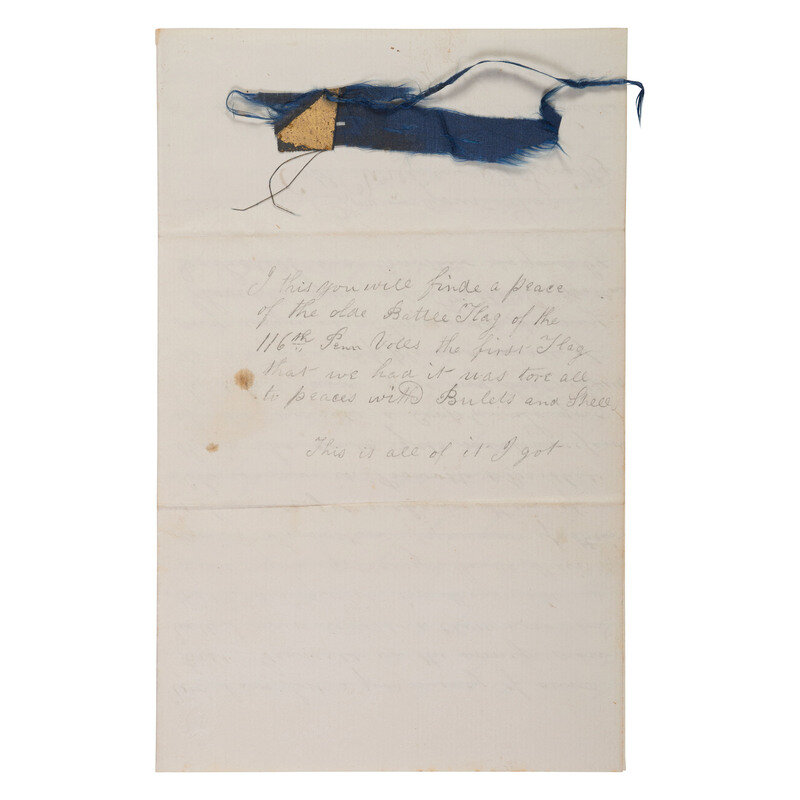[Civil War]. War-date letter and "Battle Flag" fragment from Corporal William A. Smith, 116th Pennsylvania Regiment, part of the famed Irish Brigade.