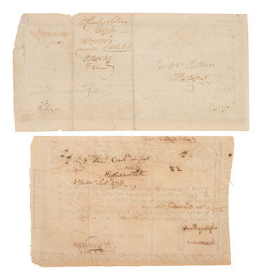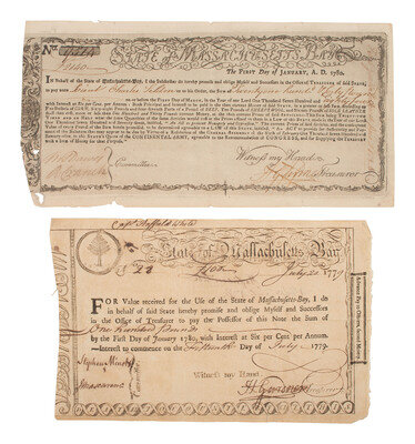 [REVOLUTIONARY WAR]. Group of 2 State of Massachusetts Bay items, comprising a 1780 Continental Army Commodity Bond and a 1779 "Pine Tree" emblem Treasury Loan Certificate.