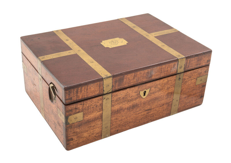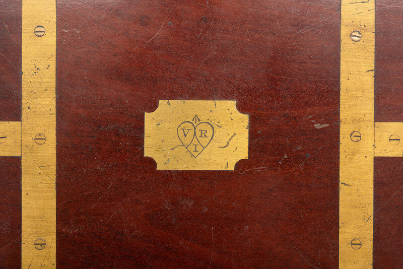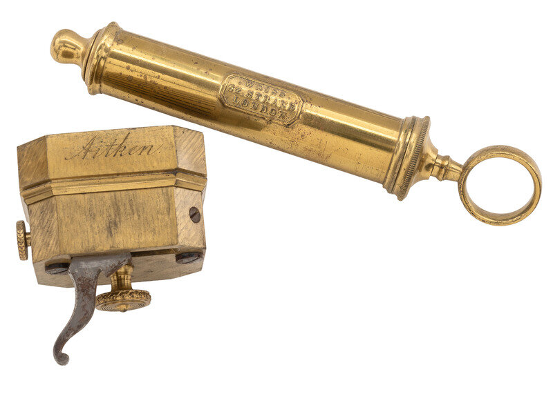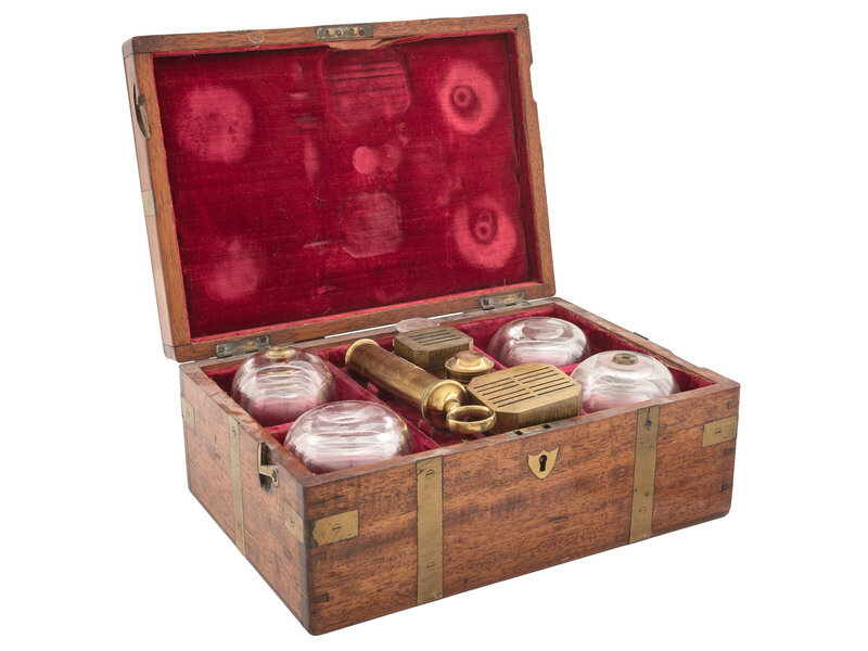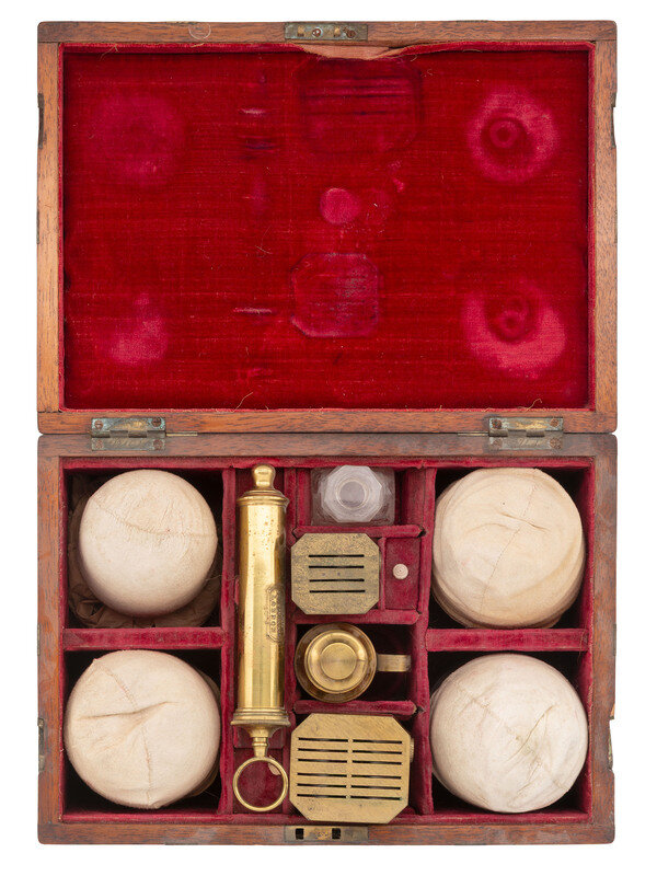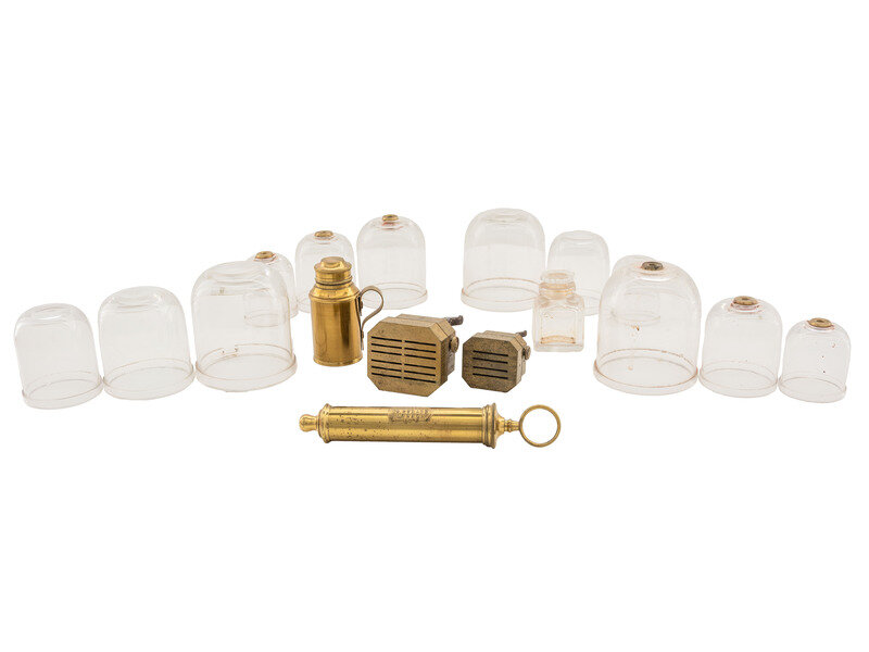Wooden case with brass inlay including cartouche to lid bearing heart-shaped design and initials V. R. I., overall 10 x 7 x 4 in., with divided interior lined in velvet. Contains 17 pieces, including 12 glass cups, a glass vial, 2 scarificators (one marked "Savigny & Co," the other marked "Aitken"), a brass spirit lamp, and a brass syringe marked "Weiss / 62 Strand / London." Also included are fabric protectors for each glass cup, two small flat brass pieces of unknown function, and a small wooden box.