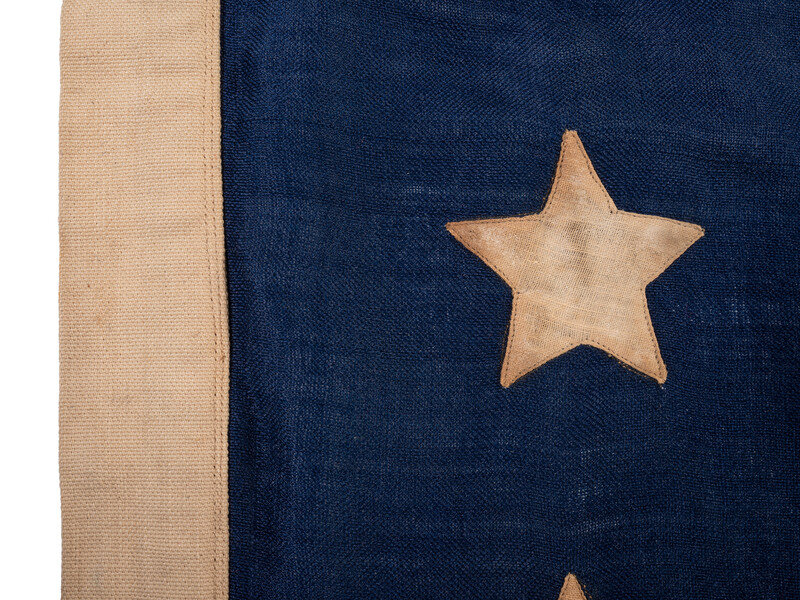 Approx. 49 by 70 in. wool flag with 36 double-appliquéd cotton stars machine sewn to a two-part wool canton, configured in a pattern comprised of horizontal rows 6/6/6/6/6/6. The field consists of 13 machine-sewn wool stripes. Hoist is cotton with two brass grommets, and includes inked notations and "4 x 6" stencil on reverse side. With gold-colored, silk fringe border sewn along three sides of the flag, which is a rare feature of the flag likely produced near the end or soon after the conclusion of the Civil War.