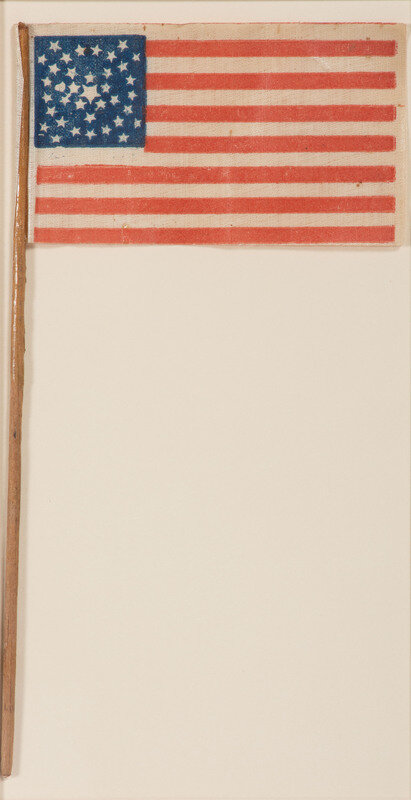 2 1/8 x 3 7/8 in. printed, glazed cotton flag comprised of a "Great Star" set within a wreath of stars and flanked by two stars in each corner, which is an exceptionally rare feature of the flag. Attached to original stick. Framed, 12 3/4 x 8 1/2 in. overall.