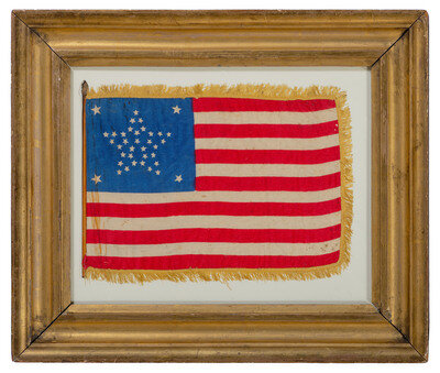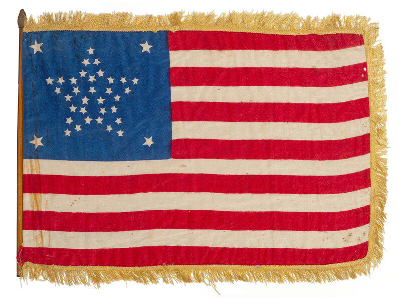 7 1/2 x 11 1/4 in. silk flag with 38 stars arranged in a "Great Star" configuration. This particular "Great Star" consists of twenty-five stars in its outline, nine stars inside of the outline, and four flanking stars surrounding the outline, which are slightly larger than the others. With gold-colored, silk fringe border sewn along three sides of the flag. The hoist end is affixed to a partial staff. Framed for display, 15 1/2 x 18 1/2 in. overall.