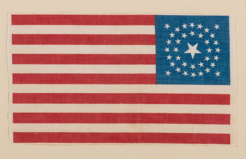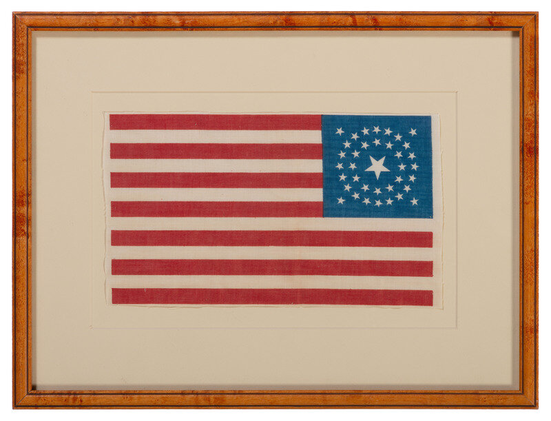 6 x 10 1/4 in. flag printed on cotton, with 37 stars configured in double medallion pattern, with large central star, flanked by star in each corner. Framed, 12 x 16 in. overall. The 37-star flag commemorates the statehood of Nebraska, which was admitted to the Union in March 1867.