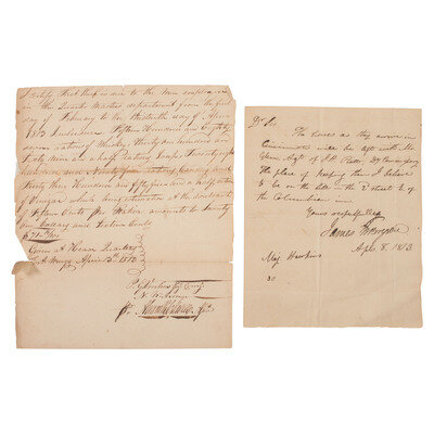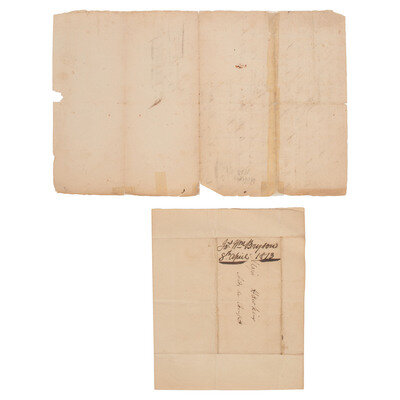 [With:] BRYSON, Captain James W. Bryson. Letter signed ("James W. Bryson"), likely as assistant deputy quartermaster general at Newport, Kentucky. Integral address leaf addressed to "Major Hawkins / Aid[e] de Camp," likely Joseph H. Hawkins (1786-1823), aide decamp of Brigadier General Green Clay, Kentucky Militia, 1st Brigade. N.p., 8 April 1813. 1p, approx. 6 1/4 x 7 3/4 in. (creasing at folds, toning). Bryson writes, "The horses as they arrive in Cincinnati will be left with Mr. Glenn, Agt of J.H. Piatt, D Commissary."