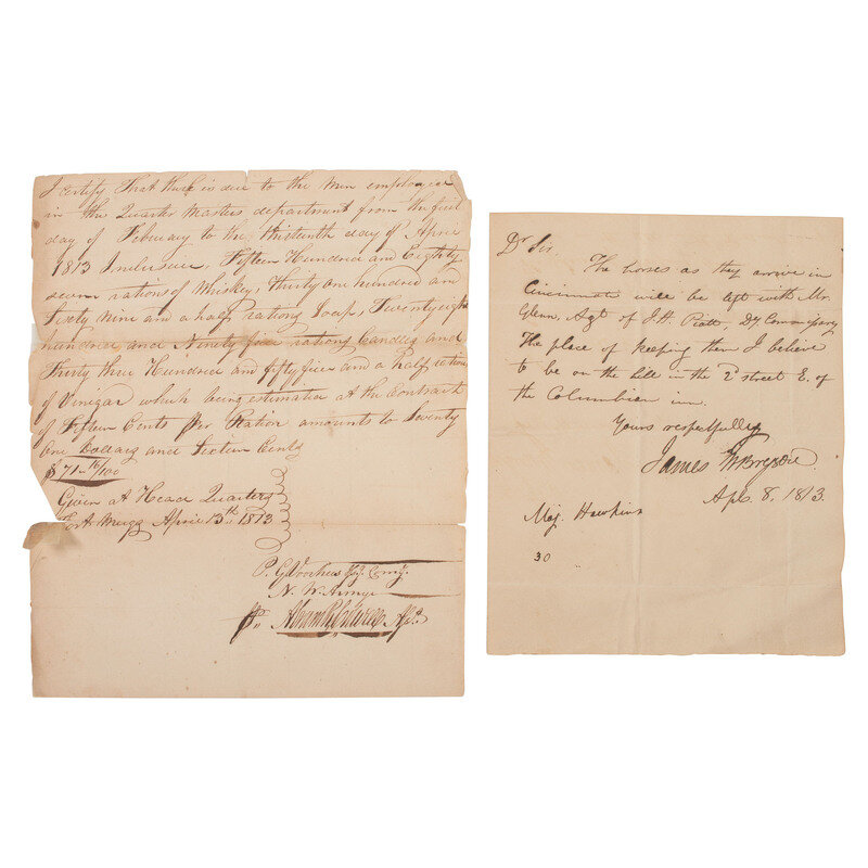 VOORHEES, P.G. Autograph letter signed ("P.G. Voorhees"), Commanding "N.W. Armys." Head Quarters, Fort Meigs, 13 April 1813. 1p, approx. 8 x 12 1/4 in. (creasing at folds, small loss at left edge line, approx. separated along center fold, adhesive repair to verso). Vorhees certifies that "there is due to the men employed in the Quarter Masters department from the first day of February to the thirteenth day of April 1813 Inclusive Fifteen hundred and Eighty seven rations of whiskey, thirty one hundred and seventy nine and a half rations soap, twenty eight hundred and ninety-five rations Candles and Thirty three Hundred and fifty five and half rations of vinegar...."