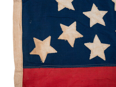 Approx. 52 by 94 in. cotton flag with 38 double-appliquéd cotton stars machine sewn to a cotton canton, configured in an unusual pattern comprised of vertical rows 4/5/4/5/4/5/4/5, with one star added in each corner near the hoist end. The field consists of nine cotton, machine sewn stripes, the canton resting on a red stripe. The hoist is cotton.