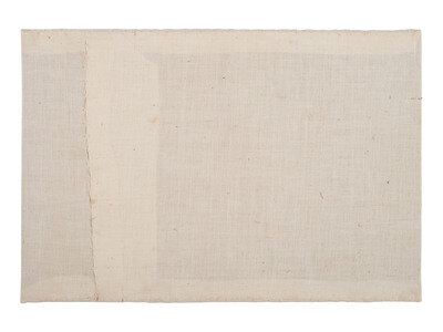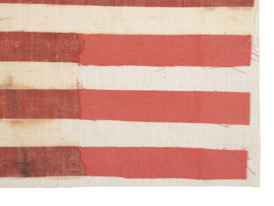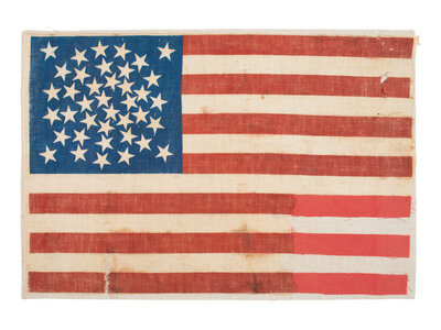 10 x 15 in. flag printed on cotton, the 39 stars arranged in a triple medallion or global configuration with a star in each corner. Partially mounted to 10 1/2 x 15 1/2 in. canvas. Area of loss near lower right corner of field (approx. 4 x 4 1/2 in.)