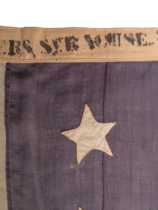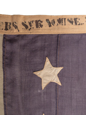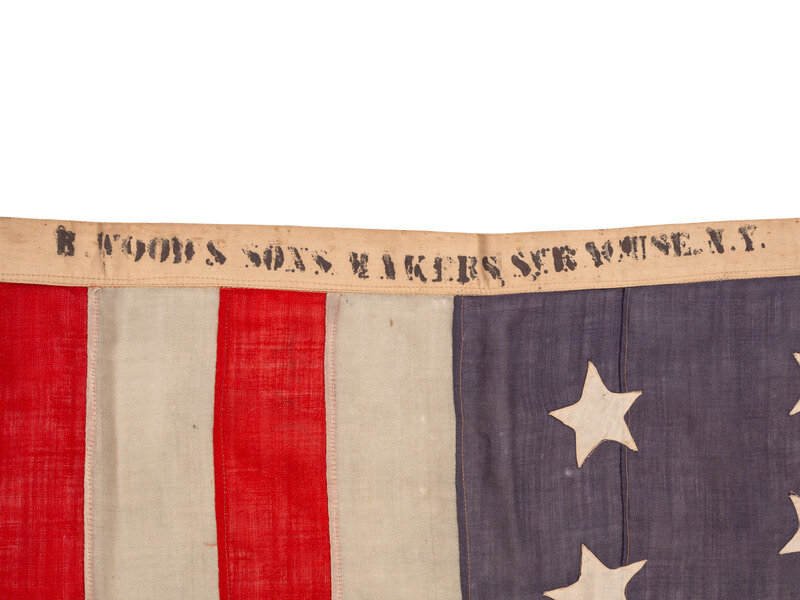 Approx. 45 x 69 in. wool flag with 13 double-appliquéd cotton stars machine sewn to a two-part wool canton, configured in a pattern comprised of horizontal rows 4/5/4. The field consists of 13 machine-sewn wool stripes, with black tulle stitched to the reverse side of the topmost stripe. Hoist is cotton with two brass grommets, and stenciled with maker's name on the header, "B. Woods Sons Makers SVB (?) House (?) N.Y."