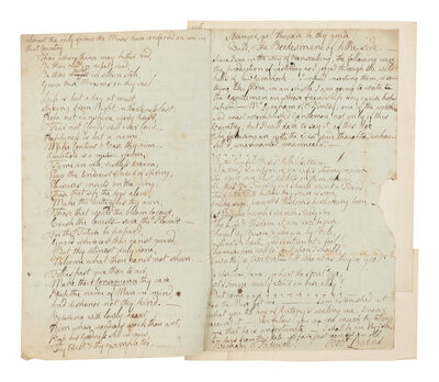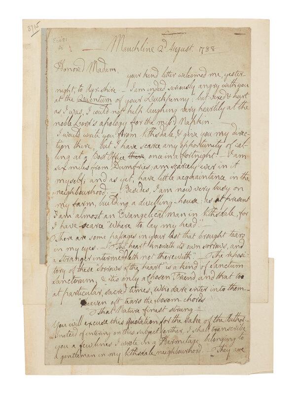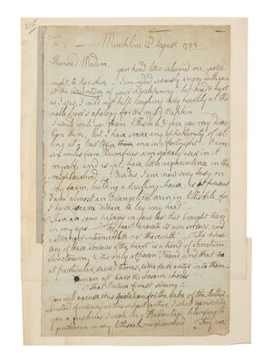 THIS LETTER STANDS AMONG THE MOST INTIMATE OF THE BURNS-DUNLOP CORRESPONDENCE, which began in 1786 as Frances Dunlop (1730-1815) was struggling with depression after the loss of her husband, when a friend handed her a copy of Burns’s “The Cotter’s Saturday Night.” Moved by the poem, she wrote the young poet, asking for several copies and inviting him to visit her at Dunlop House—an overture that marked the beginning of a friendship and correspondence more voluminous than any other in Burns’s life. Though nearly thirty years his senior and from a different social world, Dunlop became both confidante and critic to Burns. He regularly sent her poems—often in manuscript before publication as seen here—and confided his joys and anxieties, while she offered advice and, at times, stern commentary, even admonishing him about the impropriety of his affairs: She described his correspondence as "an acquisition for which mine can make no return, as a commerce in which I alone am the gainer; the sight of your hand gives me inexpressible pleasure…”.