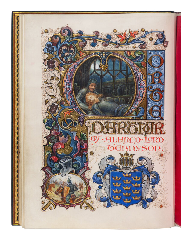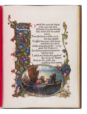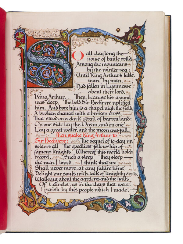 THE HEIGHT OF EDWARDIAN ENGLISH BOOK ART IN A SPECTACULAR BINDING, this unique manuscript showcases the greatest English calligrapher and miniaturist, celebrating and illuminating the greatest epic poem of the Poet Laureate of the Victorian Age. The title-page contains a large historiated initial "M" enclosing a fine large miniature showing Sir Bedivere holding the head of the dying King Arthur in his arms, within an elaborate floral border in colors and burnished gold framed with crossed swords and surmounted with an Arthurian helmet in silver and gilt; in the lower right is a heraldic shield containing Arthur's coat-of-arms of 13 gold crowns. The facing page opens the text with a large illuminated initial "S" in colors and burnished gold with an elaborate, full decorated border historiated with dragons and fantastic creatures in colors and heightened with burnished gold. The final page of the poem's text is bordered on three sides incorporating an illuminated initial "S" and a large vignette at foot portraying Arthur's funeral barge with the weeping maidens bending over the dead king; the text throughout is decorated with 6 other illuminated initials mostly decorated in colors and burnished gold, some with partial borders, the decoration in bright, bold colors of orange, purple, blue and green, mostly in a Gothic style.