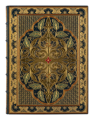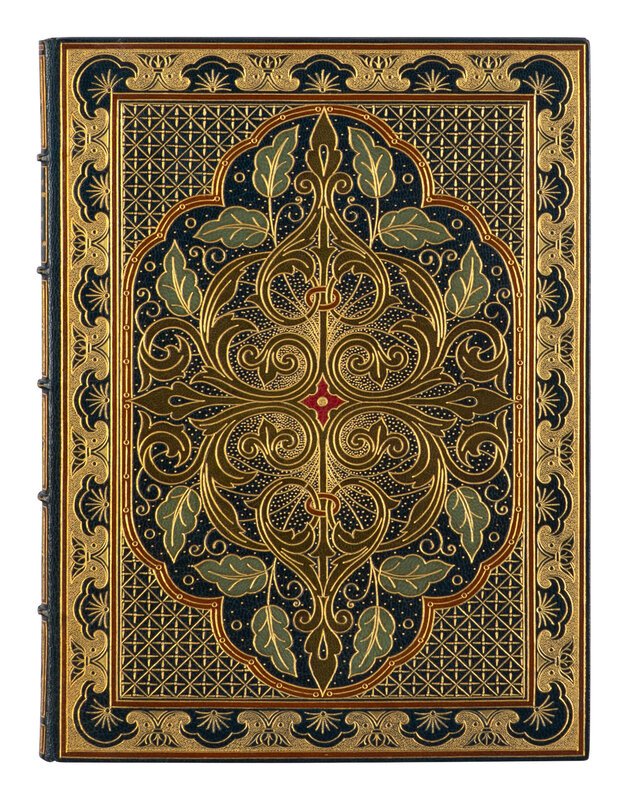 IN AN EXCEPTIONAL BINDING BY RIVIERE. Contemporary blue levant, each cover with outer borders comprising a stylized floral pattern in gilt pointelle framed in onlaid tan morocco, surrounding a large central arabesque panel decorated with a symmetrical foliate design in olive, red and aquamarine morocco onlays and bordered in onlaid tan morocco, corner areas between the central panel and outer border decorated in an all-over geometric gilt design, spine in six compartments with 5 raised bands, gilt-lettered in one, a repeated gilt pointelle panel bordered in onlaid tan morocco in the rest, board edges with single gilt fillets, turn-ins with borders of braided interlace design in gilt pointelle, framed within tan morocco borders; cream watered silk doublures and liners, edges gilt, stamp-signed on upper turn-in: "bound by Riviere & Son" (some slight discoloration from adhesive on silk liners; front silk liner becoming a little detached from vellum free endleaf); housed in a water-silk lined straight-grained morocco clamshell case. Provenance: Katharine Gordon Adamson (lettered on doublure in gilt); sold, Parke-Bernet, 2-4 April 1941, lot 367 (lot tag laid in); Kroch & Bretano's (typed catalogue note laid in, signed by Alfred Kroch).