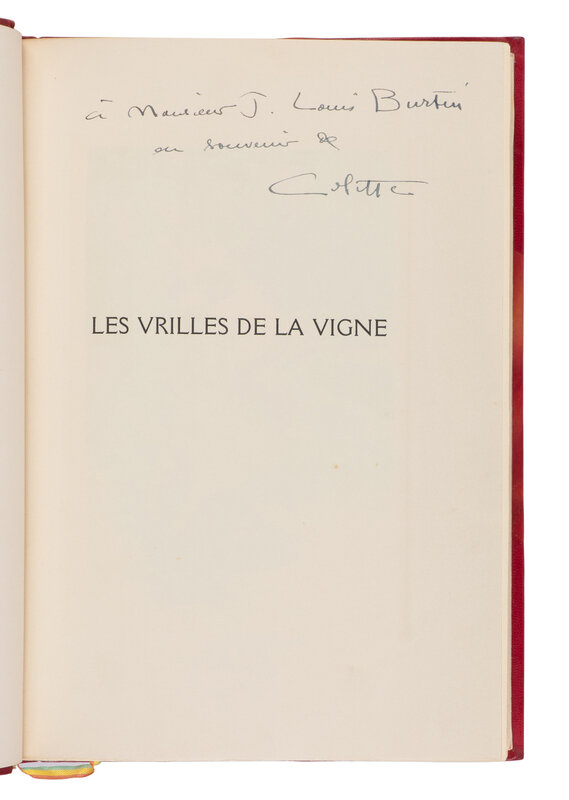 [With:] Autograph letter laid in, noting the provenance: "It was given to my father after the war, a friend of his "Louis Burtin" knew Colette and to thank my father, he gave him this book. Louis Burtin was an attorney in Nancy...and was very involved in the French Resistance during the war, so was my father!"