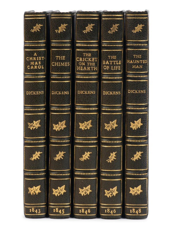 Together, 5 works in 5 volumes, all 8vo, all illustrated and uniformly bound in modern forest green morocco gilt, stamp-signed by Bayntun-Riviere; each with original cloth covers bound in. A COMPLETE SET OF THE CHRISTMAS BOOKS. Dickens sought to publish a Christmas-themed story each December, which would "'strike a sledgehammer blow' for the poor, uneducated, and repressed." Though all five books were popular, none achieved the cultural staying power of A Christmas Carol, which would be the centerpiece of Dickens's reading tours throughout the following two decades. Eckel pp.110-125; Smith II:4-6, 8-9.