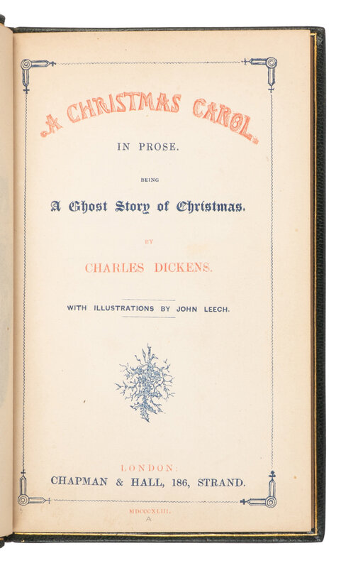 1) A Christmas Carol. In Prose. Being a Ghost Story of Christmas. London: [Bradbury and Evans for] Chapman & Hall, 1843. Half-title printed in blue, title printed in red and blue, verso printed in blue, hand-colored steel-engraved frontispiece and 3 hand-colored steel-engraved plates by John Leech (a few heightened in gum arabic), 4 wood-engravings in the text by W.J. Linton after Leech; 2pp. publisher's advertisements at end. FIRST EDITION, second issue with the corrected “Stave One” as the first chapter heading, the balance of the text uncorrected. The binding has the first state "D" of Dickens unbroken, and the closest interval between the blind decorative border on the left and the left extremity of the gilt cartouche measuring 14-15mm.