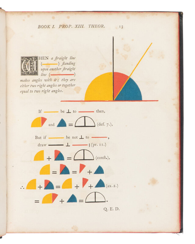 FIRST EDITION. Oliver Byrne was a mathematician and civil engineer whose colored graphic explanations of each geometric Euclidean principle were considered to be his most innovative work. The combination of color and geometry was of particular influence during the 20th century on the Bauhaus and De Stijl art movements, especially the works of Wassily Kandinsky, László Moholy-Nagy, and Piet Mondrian. Ing, Charles Whittingham Printer 46; Keynes, Pickering, pp.37, 65; McLean, Victorian Book Design, pp.53.