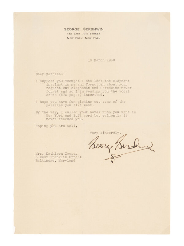 In his letter, Gershwin responds to Mrs. Cooper's previous request by sending her a copy of the 570-page vocal score to Porgy and Bess, published earlier that year in January 1936. "I suppose you thought I had lost the elephant instinct in me and forgotten about your request but elephants and Gershwins never forget so I am sending you the vocal score (570 pages) inscribed. I hope you have fun picking out some of the passages you like best. By the way, I called your hotel when you were in New York and left word but evidently it never reached you. Hoping you are well, Very sincerely, George Gershwin."
