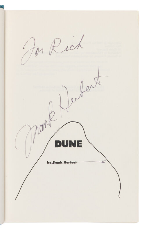 Frank Herbert spent over five years researching, writing, and revising his manuscript for Dune, which would go on to win the 1965 Nebula and 1966 Hugo Awards for Best Novel and is today regarded as one of the greatest science fiction novels ever published. The work gained particular acclaim for its emphasis on human relationships over technology, as well as its exploration of various cultural influences. It was first adapted into film in 1984 by David Lynch and was adapted again into a trilogy directed by Denis Villeneuve, with the first installment releasing in 2021 and going on to win six Academy Awards. According to his son, Brian Herbert, the whole edition comprised 3,500 copies, of which 1,300 defective copies were discarded. Correspondence between Herbert's agent and Chilton Books shows that many were distributed to libraries. Anatomy of Wonder (2004) II-524; Currey, p.238; Pringle, Science Fiction: The 100 Best Books 48. A BRIGHT COPY OF ONE OF THE BEST-SELLING SCIENCE FICTION NOVELS OF ALL TIME.