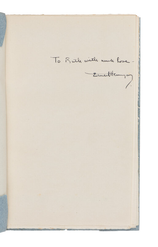 PRESENTATION COPY, INSCRIBED BY HEMINGWAY TO HIS COUSIN on the front free endpaper: "To Ruth with much love—Ernest Hemingway." Hemingway and his second wife, Pauline, came to Kansas City in June 1928 for the birth of their first son, Patrick, at Research Hospital. They stayed at the home of Hemingway's cousin, Ruth, and her husband, William Malcom Lowry. Pauline underwent a life-threatening cesarean section during the birth. While she was recovering in the hospital, Hemingway began writing A Farewell to Arms.