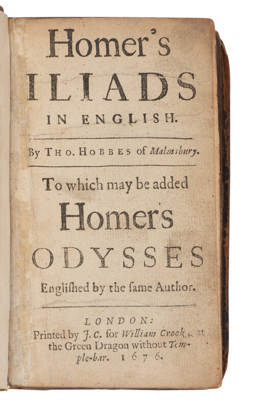 FIRST EDITION OF HOBBES'S TRANSLATION OF HOMER'S ILIAD, completed at the end of his life when censorship meant he no longer had other means of expressing his views in print. It is believed that his Homer continued with the arguments of Leviathan. For example, on the rightful place of kings, Hobbes depicts Agamemnon as a more worthy king than in Homer. ESTC R29487; Macdonald & Hargraves 76; Wing H2558.