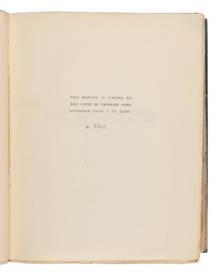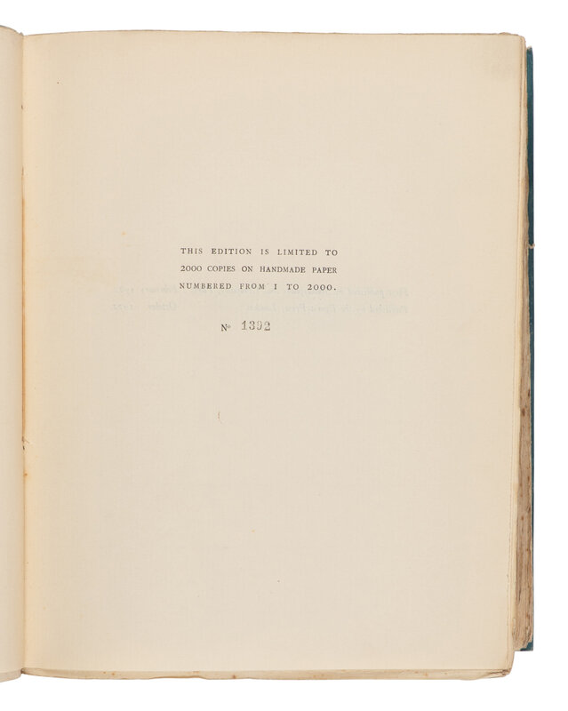 FIRST ENGLISH EDITION, LIMITED ISSUE, number 1392 of 2000 copies on handmade paper printed in Dijon from the original plates for Joyce's patron, Harriet Weaver, who was unable to find a printer in London, and distributed by Rodker and Ezra Pound.