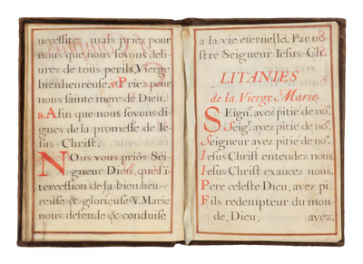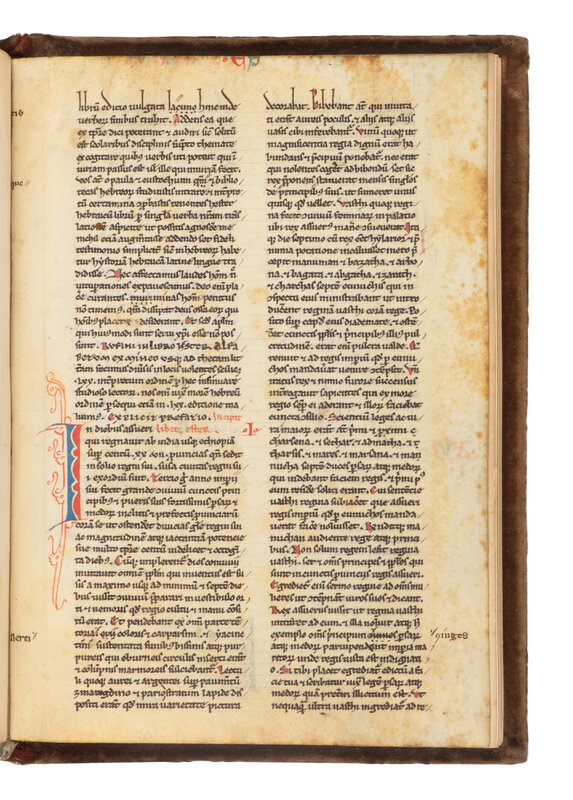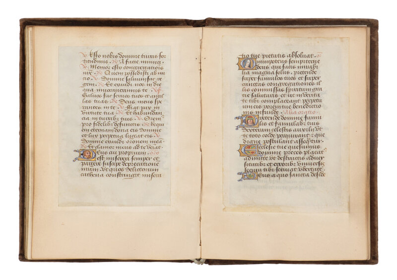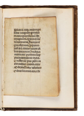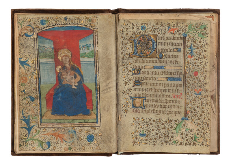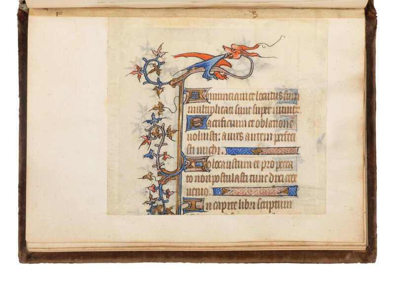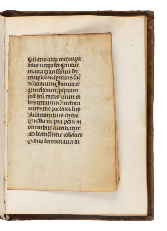 Most written in gothic hands with one illuminated miniature believed to be of 14th century French origin, depicting a dragon in flight and a full-page scene of the Virgin with Child seated upon a throne, as well as a partially restored, in old facsimile, full page scene of an angel visiting Jesus Christ. The early manuscript leaf is in 52 lines, double-columned with one 8-line initial and one 6-line initial. Most leaves window-mounted, others bound-in. (Some soiling to leaves, two leaves trimmed, spotting throughout). Late 19th century velvet over boards, all edges gilt (light rubbing to extremities, some darkening).