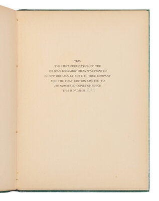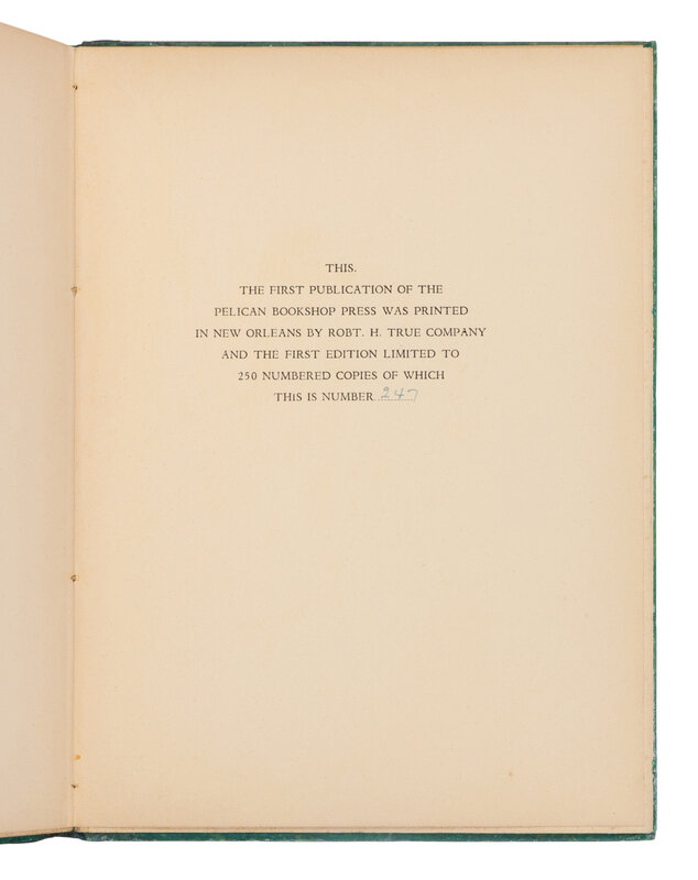 FIRST EDITION, LIMITED ISSUE, number 247 of 250 copies. FIRST ISSUE, without the pasted over second colophon slip. Although the limitation statement records only 250 copies, Petersen notes that 400 were actually produced. Of these, the first 50 were hand-tinted by Spratling followed by 200 uncolored copies numbered through 250. The remaining 150, issued as a second state, bear an added label pasted over the printed limitation.