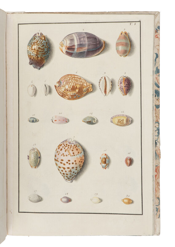 Folio (406 x 279 mm). Half-title, title-page with emblematic engraved vignette by C. Schütz, 4 headpieces and 8 tailpieces, 36 in-text illustrations of shells, all engraved by Schütz, C. Conti and others, 18 plates (17 fine hand-coloured engraved plates of shells by Schütz or J. Adam after Fr. Fuxeder and 1 plate [Plate 4] supplied in expert watercolour facsimile). Modern quarter velum, contemporary marbled boards, original lettering-piece preserved on the spine, marbled edges (light rubbing to boards).