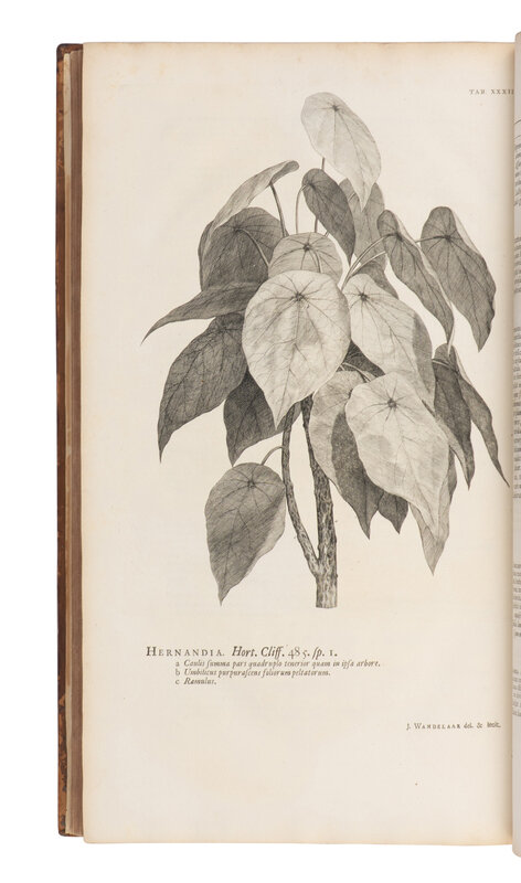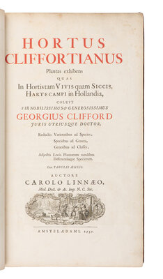 FIRST EDITION of Linnaeus' first detailed catalogue of cultivated plants. During the three years that Linnaeus spent in Holland in 1735-38, staying mostly with the wealthy Anglo-Dutch banker George Clifford (1685-1760) at his estate at Hartekamp, near Haarlem, he produced an astonishing body of work, the most important of which were his Systema naturae (1735), in which he presented his new system of the plant, animal and mineral kingdoms; the Fundamenta botanica, in which he set forth his theory for systematic botany; the Genera plantarum, containing short descriptions of all 935 plant genera known at the time; and the Bibliotheca botanica, a comprehensive list of botanical literature. Published at Clifford's expense, the Hortus Cliffortianus contains Linnaeus' definitions and synonyms for the numerous species in Clifford's incomparable botanical gardens, which Clifford had placed under Linnaeus' direction. Linnaeus used the work extensively to provide examples for his monumental Species Plantarum (1753). Wandelaar's engravings, most after designs by Georg Dionysius Ehret, make this Linnaeus's only truly beautiful publication. Pages 232-300 (gatherings Nnn2-Ffff2) are omitted as issued. Cleveland Collections 387; Dunthorne 186; Hunt 504; Nissen BBI 1215; Norman 1358; Stafleu & Cowan TL2 4719; Wellcome III, p. 552.