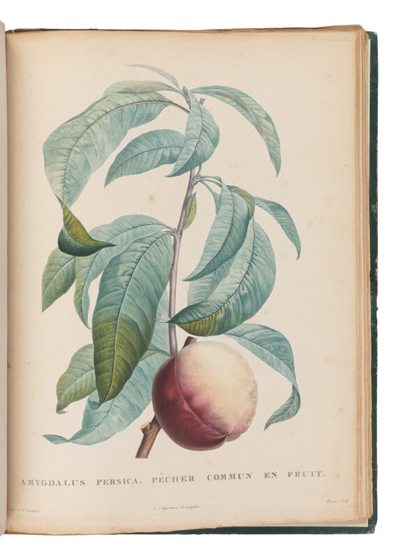 Large 4to (368 x 279 mm). Half-title, engraved title-page; 65 stipple-engraved plates printed in colors and finished by hand by Bouquet, Chailly, Delelo, etc., after PIERRE JOSEPH REDOUTE. (Spotting, marginal toning.) Contemporary straight-grain green morocco gilt, uncut (rebacked, preserving original spine, lower cover and spine detached, renewed endpapers).