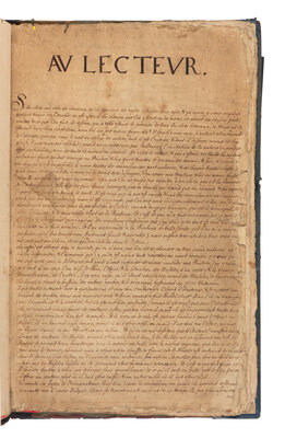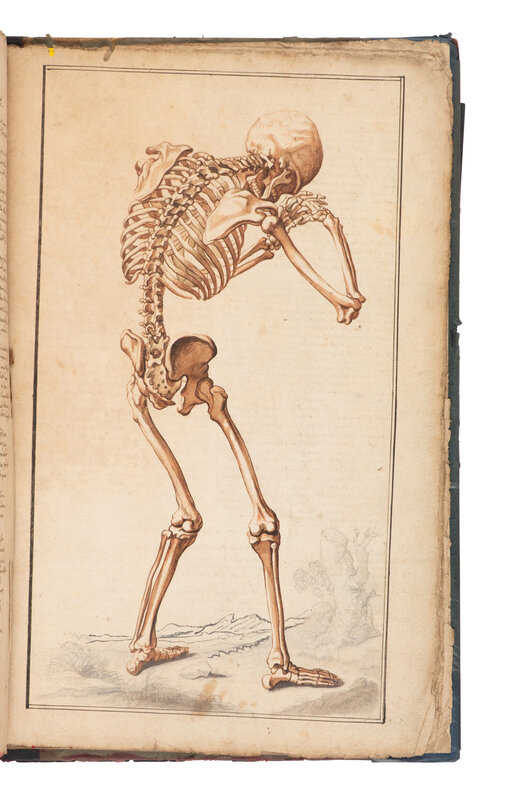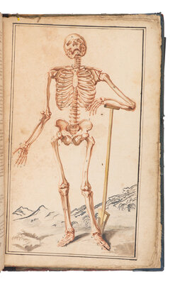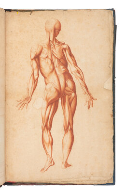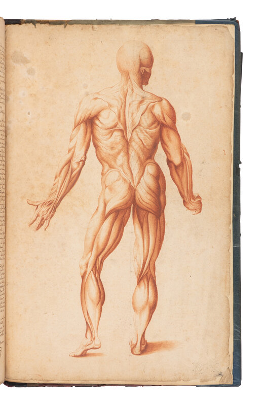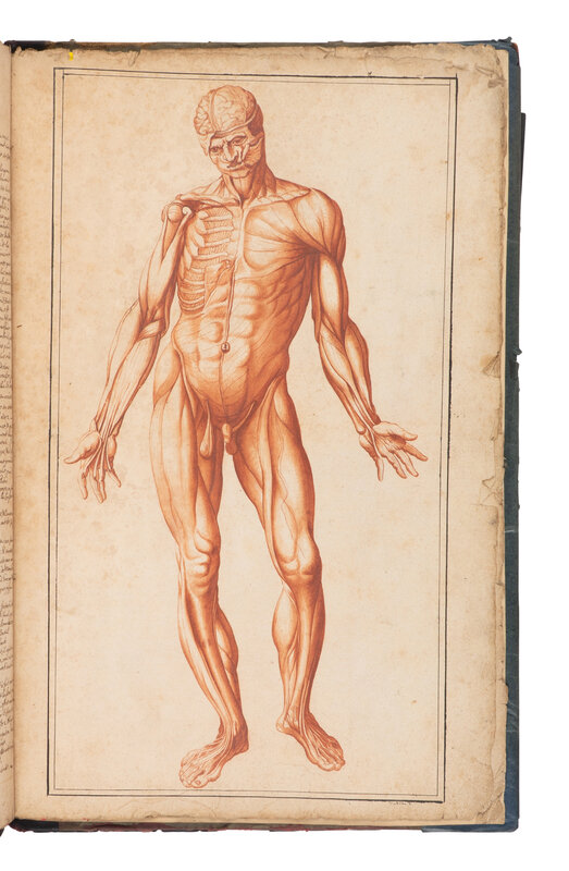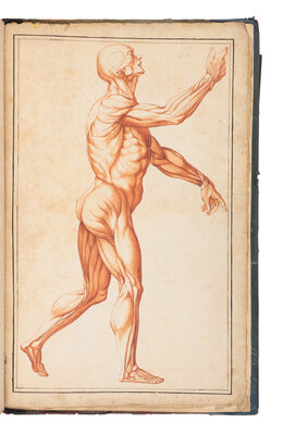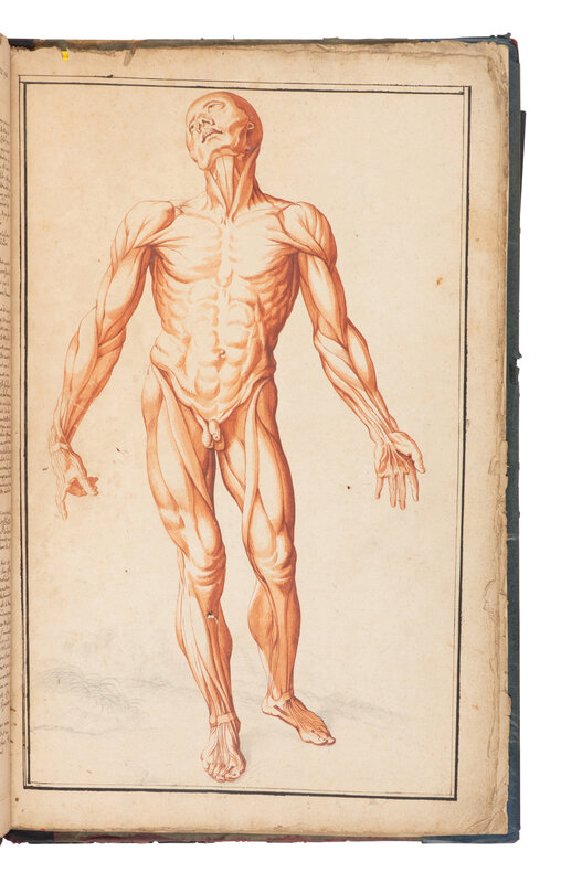 Abrege d'Anatomie, was first published in Paris in 1667 and was the earliest work on anatomy intended for the use of artists. The illustrations, after Tortebat’s copperplates, were "designed for artists [and] are by common consent the most beautiful reproductions of Vesalius’ illustrations ever to be made” (Cushing, p.144). The skeletal illustrations are based on the Fabrica, and the "musclemen" are from the Epitome. The present manuscript, although partial, matches the text and design of the plates exactly that of the 1667 Abrege. Contains only the half-title, "Au lecteur," 7 tables, and 9 full-page illustrations.