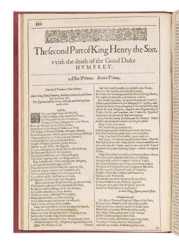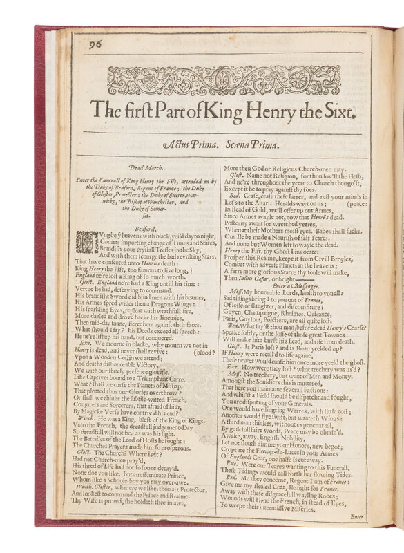 SECOND FOLIO PRINTING OF FOUR COMPLETE PLAYS. In Henry V, an insult from a French Dauphin pushes the King of England to invade France to claim what he believes to be his rightful throne. This play encompasses the events before and after the Battle of Agincourt during the Hundred Years' War.