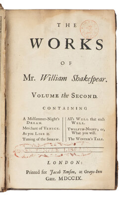 Commissioned by the publisher Jacob Tonson, Rowe’s edition modernized Shakespeare’s spelling and punctuation, divided plays into acts and scenes, and included dramatis personae lists—innovations that shaped later editorial practice. It was also prefaced by Some Account of the Life &c. of Mr. William Shakespear, often regarded as the first biographical sketch of the playwright, drawing upon information gathered by the actor Thomas Betterton. In 1710, a seventh volume appeared under the title The Works of Mr. William Shakespear. Volume the Seventh: Containing Venus & Adonis, Tarquin & Lucrece, and His Miscellany Poems, produced by the publisher Edmund Curll and likely edited by Charles Gildon. Although not authorized by Tonson or Rowe, this supplement was marketed to accompany purchasers of the six-volume set and is now known as one of the earliest separate printings of Shakespeare’s narrative poems and minor verse. ESTC T138294, T138298; Jaggard, p.497; Ford, pp.9-10.