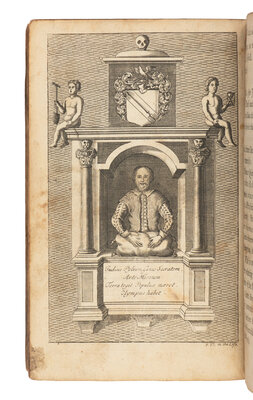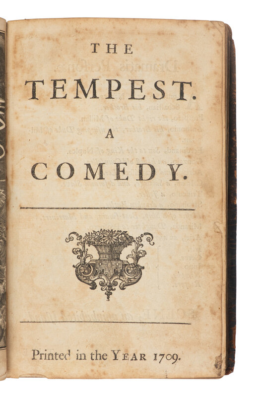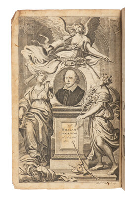 Together in 7 volumes, 8vo (197 x 127 mm). Portrait frontispiece by Van de Gucht in the first six volumes, engraved plate of the Stratford monument in the Life (p.37), and 43 plates (one at the beginning of each play); 2pp. publisher's ad at end of vol.7. (Lacking general title-page in vol.1; vol.7 lacking frontispiece, A8 [including general title] a-d8 e1 A-B8 C-C7; frontispiece and general title in vol.2 detached, offsetting from plates to title-pages, corner dampstaining to frontispieces, general titles and some text in vols. 4-6.) Contemporary paneled calf with blind-tooled sides (vol.1 is supplied to this set, spine mostly perished and lacking upper cover, others rebacked in morocco, extremities rubbed, spine ends a bit worn; the seventh volume is also supplied to this set as usual and is in a similar paneled calf, crudely rebacked in cloth). Provenance: Herbert Jacob of St. Stephens in Kent (armorial bookplate on versos of frontispieces or title-pages); Inner Temple Library (bookplates, stamps on general titles, gilt stamps on spines); College of New Jersey Library (bookplate in vol.7; pencil notations on flyleaves).